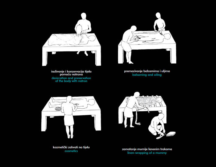 Kad bi čovjek umro lokalni kraljev službenik objavio bi njegovu smrt u mjestu gdje je živio. Nakon toga mrtvo tijelo su svećenici prenijeli u per-nefer. Tijelo je bilo položeno na poseban kameni stol, lagano nakošen s otvorima za odvod tjelesnih tekućina. Stol je završavao poluokruglim spremnikom na nižoj strani. Tijelo bi prvo bilo oprano i depilirano.