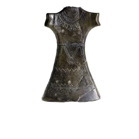 The anthropomorphic clay idol from Dalj represents a female figure in a luxuriously decorated dress. The embroidered decorations on the dress as well as the bronze jewellery are demonstrated with engraved geometric motifs, like straight, zig-zag and curved lines, concentric circles and ranges of short incisions.