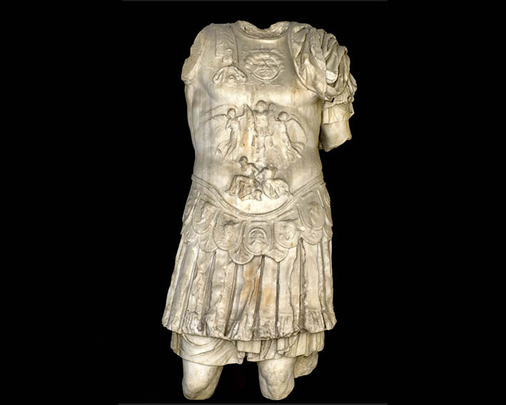 A fragmentary torso of the emperor in larger-than-life size was discovered on the island of Vis and it was previously stored in the collection of Vinko Soliter in Split. As the head of the monument is missing it is impossible to determine with assurance which emperor it represents though there is no doubt, owing to the image, that the monument represents an imperial figure. The sculpture is dressed in a short folded tunic above which he wears richly decorated breastplate armour from which two rows of pterygia or folds come hanging down.