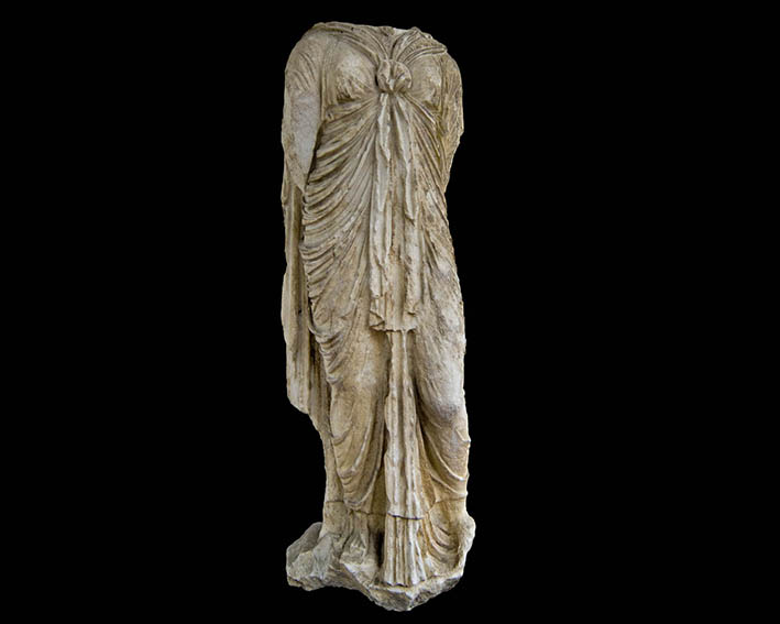 The marble statue of the goddess Isis in life size, unfortunately with the head and arms missing, originates from Nin, the Roman Aenona. The typical dress consists of the Ionic chiton above which a robe is thrown over; there is a typical knot tied between the breasts as well as the characteristic lock of hair that falls down the shoulders onto the breast. All these details indubitably prove that this is the representation of Isis, the deity of Egyptian origin, popular all across the Roman Empire.