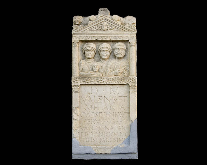 It is a tombstone stele of the slaves Valens, his wife Melania and their children, the daughter Valentina and son Donicus, dated to the 2nd century A.D. Beside its size and quality production, this monument is one of the rare tombstones raised to slaves.