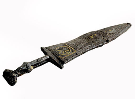 The rosette in the third field, in the same way as in the first, is not lined with a laurel wreath but with a plain circle. The last triangular field is decorated with the same motif as on the dagger cat. no. 16, that is a stylized branch lined with a laurel wreath. It is interesting that the dagger cat. no. 24 was sheathed into the scabbard back to front.