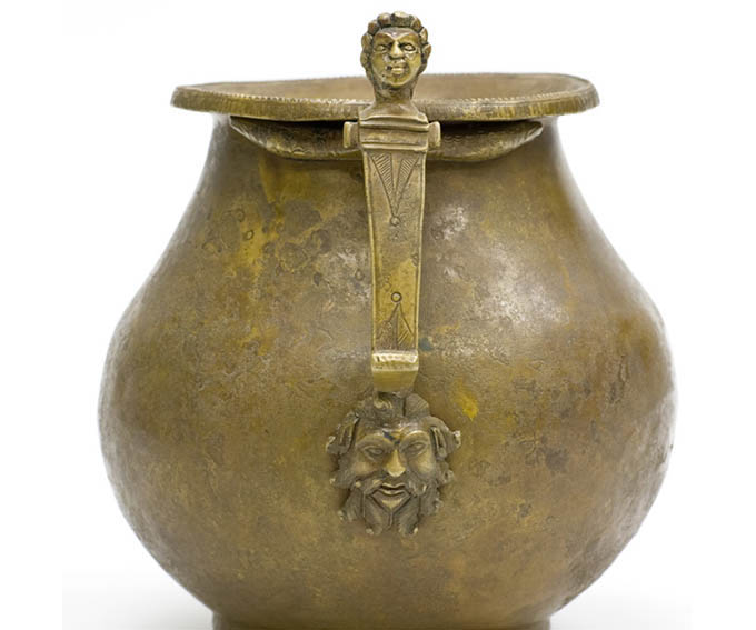 The handle is decorated by simple incised straight lines. Its lower end finishes in a satire’s head, which is in the same time the part of the handle attached to the body of the vessel.