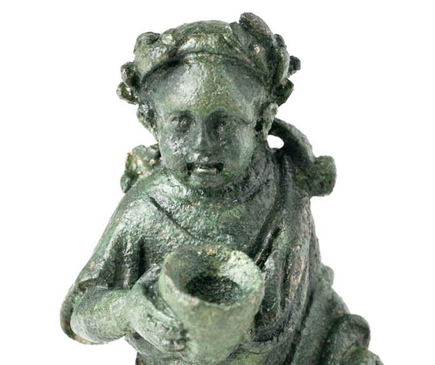 Ispod plašta proviruje falus u erekciji. Prijap u desnoj ruci drži poveći pehar, što odaje njegov dionizijski karakter. U lijevoj ruci, koja proviruje ispod teške draperije, uočava se neki predmet sličan čegrtaljci. Nad punašnim, dječačkim licem lika dominira lovorov vijenac koji okrunjuje glavicu boga.