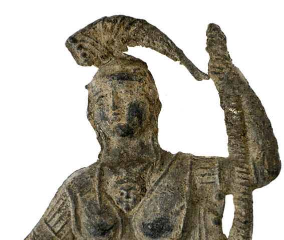 Na podnožje tordiranog koplja prislonjen je ovalni štit s gorgoneionom s prednje i drškama sa stražnje strane. Lice je detaljno modelirano, stilizirana kosa pada na ramena. Na glavi je sačuvana kaciga s krestom, izvedenom u profilu, za razliku od ostatka figure. Figura je šuplje lijevana, postament nije sačuvan.