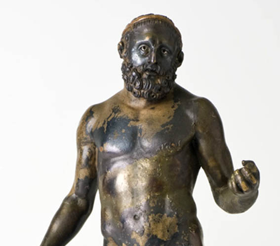 Glatkoća tijela i smirenost linija tijela u potpunoj je suprotnosti sa minuciozno obrađenim licem figure izražajna pogleda (inkrustacija zjenica nije sačuvana), obavijenim sitnim kovrčama brade i brkova, ali i kose ukrašene bakrenom vrpcom (taenia). Heraklova spuštena desnica još uvijek drži vrh batine, dok su u podignutoj ljevici tri hesperidske jabuke. Vrh batine nedostaje.