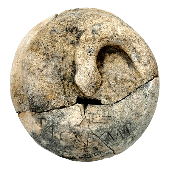 A lid of a stone container, which had been used to collect money as gifts and the money thus collected would be used to address the needs of the sanctuary. On the upper side there is a slot for inserting coins, with a relief of the head of a snake next to it, whose body entwines the outer surface of the lid. The lateral sides (next to the lower edge) are